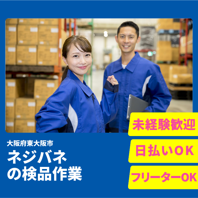 給与詳細 月収例 220,000円 日給例 10,400円 勤務地 大阪府東大阪市 仕事内容 【ネジやバネの検品】