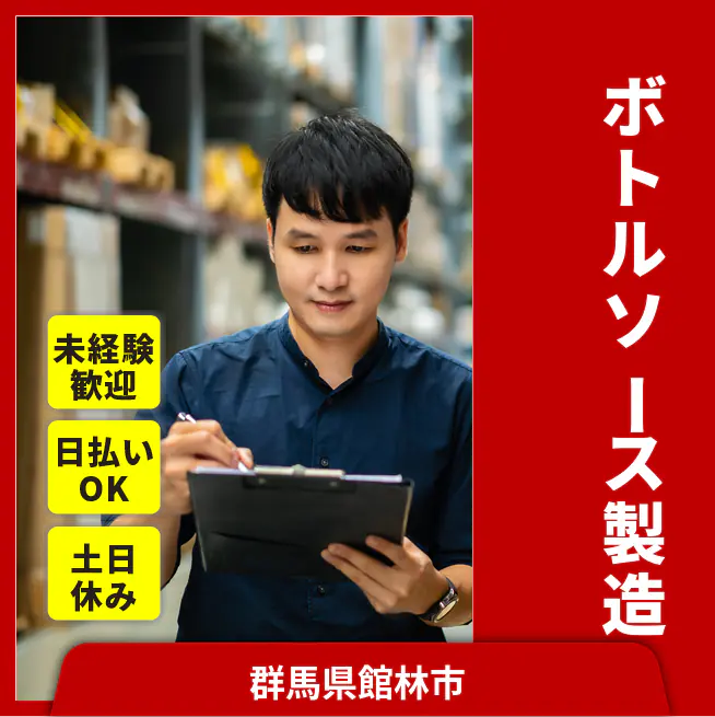 ◆日払い・仮払いOK(アプリでカンタン申請!) 交通費 支給あり 応募の流れ 本ページ内<応募する>ボタンより、必要項目をご入力の上、ご応募ください。 勤務地 【勤務地】群馬県館林市大新田町 勤務時間 【勤務地】7:30~15:30(休憩60分)