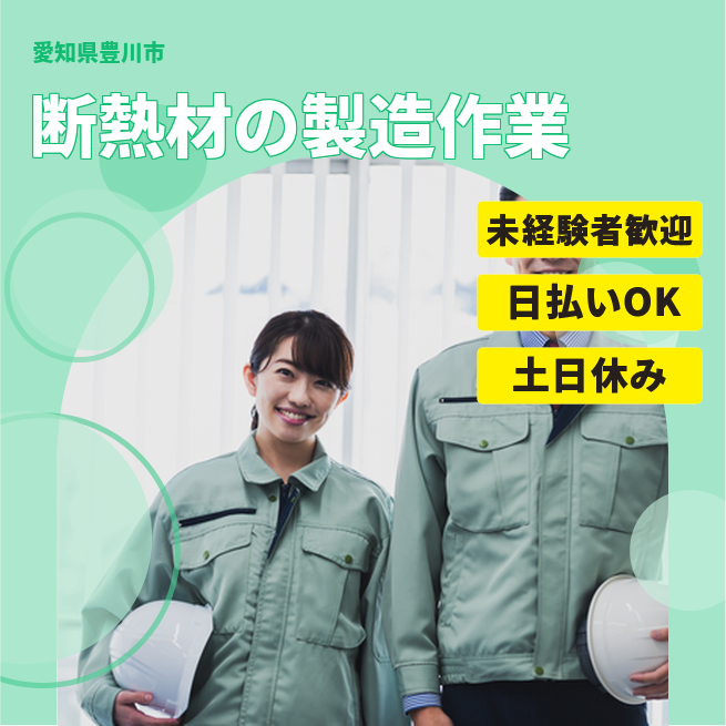 給与詳細 月収例 260,000円 日給例 11,200円 勤務地 愛知県豊川市 仕事内容 【工業用断熱材づくり】