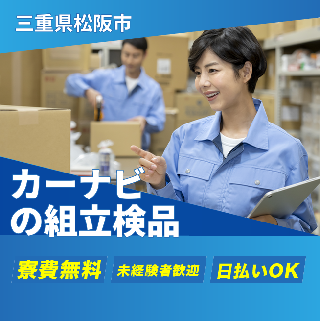 給与詳細 月収例 240,000円 日給例 11,200円 勤務地 三重県松阪市 仕事内容 【カーナビのネジ締め・検品・箱詰め】