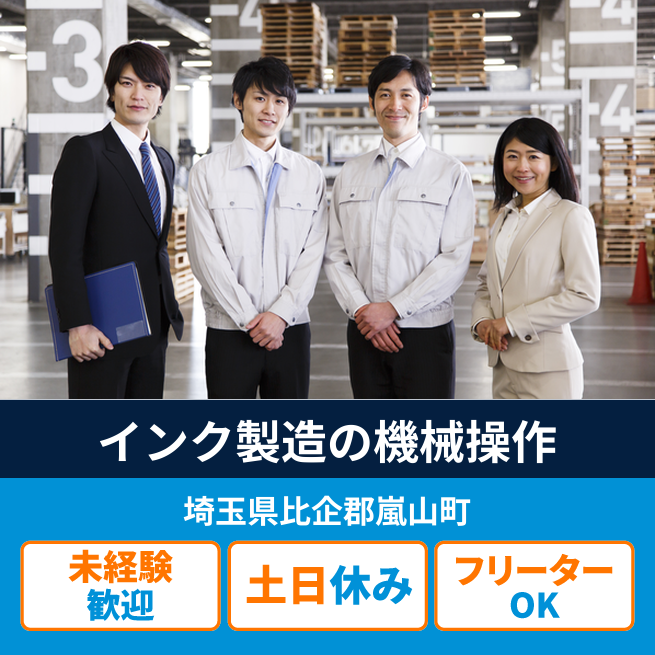 給与詳細 月収例 225,000円 日給例 11,250円 勤務地 埼玉県比企郡嵐山町 仕事内容 ウィルオブ・ワークの正社員として取引先のインク製造工場にて勤務いただきます。