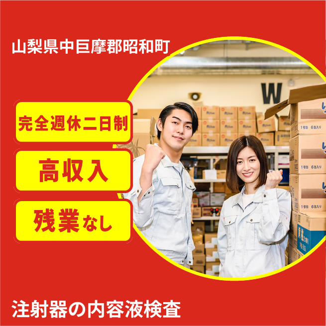 給与詳細 月収例 225,000円 日給例 11,250円 勤務地 山梨県中巨摩郡昭和町 仕事内容 薬液充填済み注射器を製造している工程でのお仕事となります。(KP3・PFS・検査・A勤)