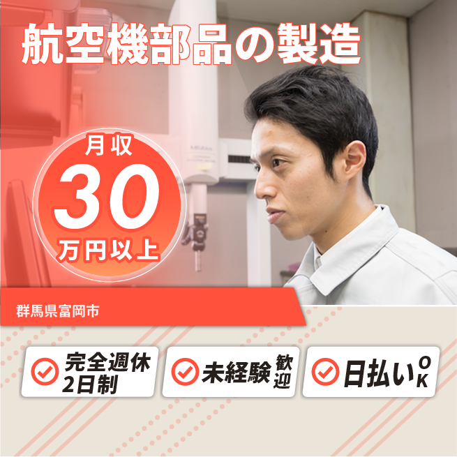 給与詳細 月収例 329,000円 時給例 1,600円 勤務地 群馬県富岡市 仕事内容 【航空機エンジン部品(ファンブレード)の製造】
