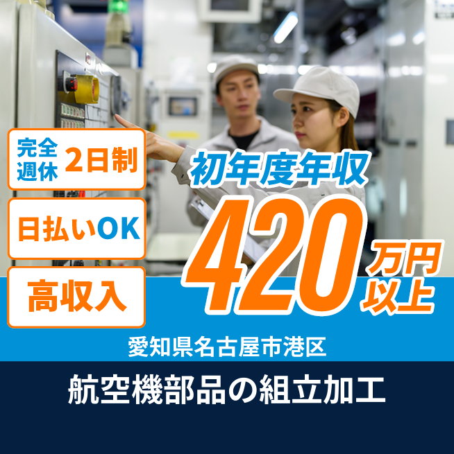 給与詳細 年収例 4,200,000円 月収例 350,000円 勤務地 愛知県名古屋市港区 仕事内容 航空機部品の組立、加工