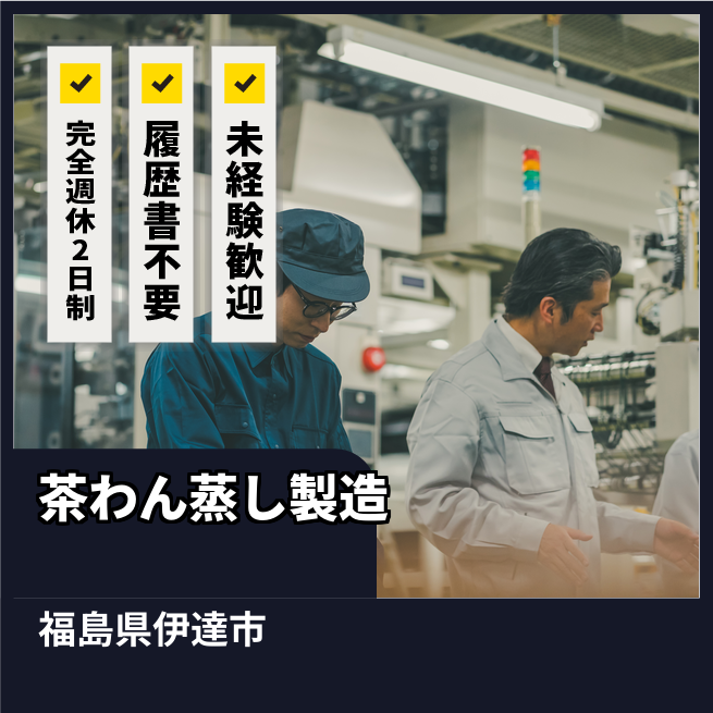 給与詳細 月収例 192,000円 時給例 1,200円 勤務地 福島県伊達市 仕事内容 茶わん蒸しの製造、具材のトッピング作業