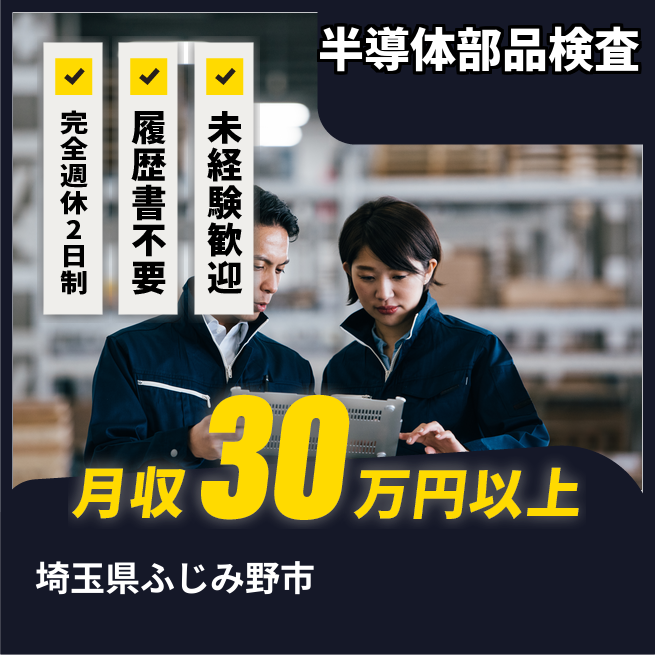 給与詳細 月収例 321,750円 時給例 1,650円 勤務地 埼玉県ふじみ野市 仕事内容 【業務内容】検査機を用いた半導体部品の検査作業