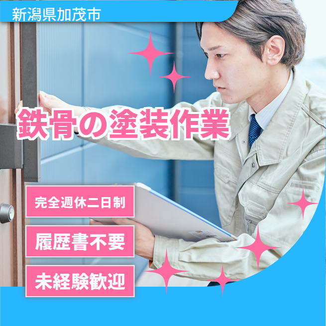 給与詳細 月収例 234,000円 時給例 1,200円 勤務地 新潟県加茂市 仕事内容 量鉄骨の塗装課にて塗装業務をしていただきます。