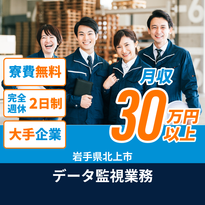 給与詳細 月収例 330,000円 時給例 1,800円 勤務地 岩手県北上市 仕事内容 【業務内容】