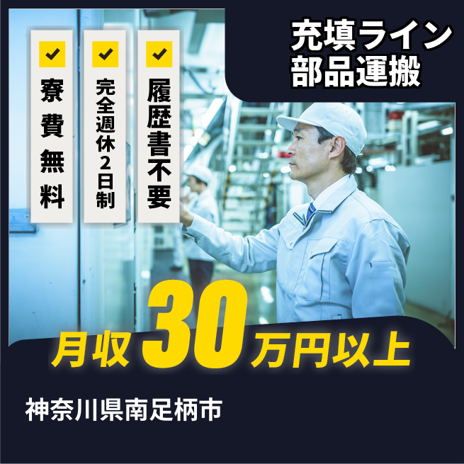 給与詳細 月収例 302,250円 日給例 12,400円 勤務地 神奈川県南足柄市 仕事内容 【充填生産ラインの部品運搬業務】