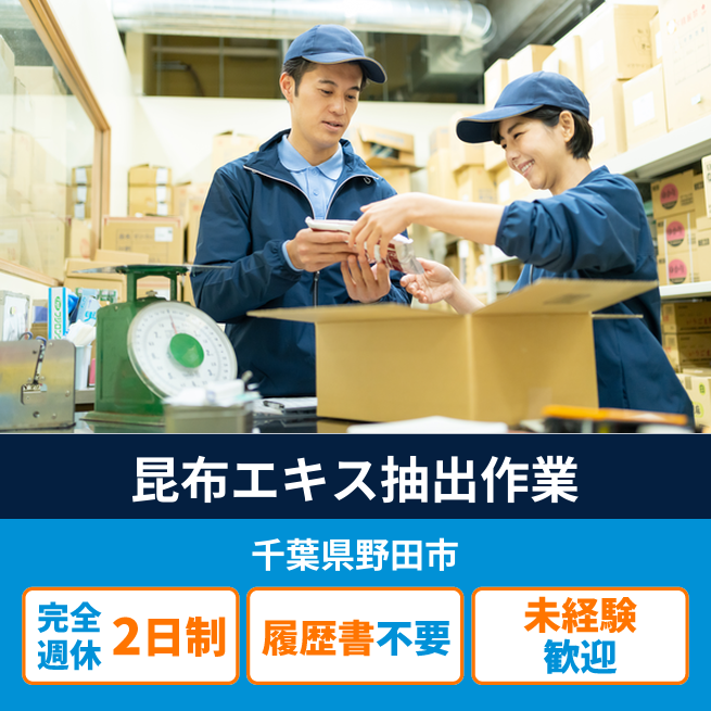 給与詳細 月収例 292,500円 日給例 12,000円 勤務地 千葉県野田市 仕事内容 ≪昆布エキスの抽出≫