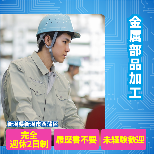 給与詳細 月収例 234,000円 時給例 1,200円 勤務地 新潟県新潟市西蒲区 仕事内容 金属部品の切断、加工。