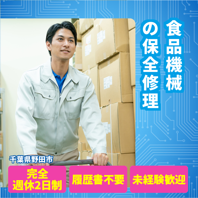 給与詳細 月収例 290,000円 日給例 14,500円 勤務地 千葉県野田市 仕事内容 ≪食品を製造する機械の保全・修理≫