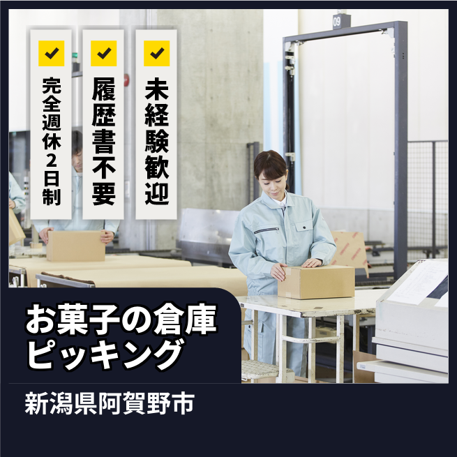 給与詳細 月収例 218,400円 時給例 1,120円 勤務地 新潟県阿賀野市 仕事内容 倉庫内でお菓子のピッキング。スーパーやコンビニ向けにピッキングします。