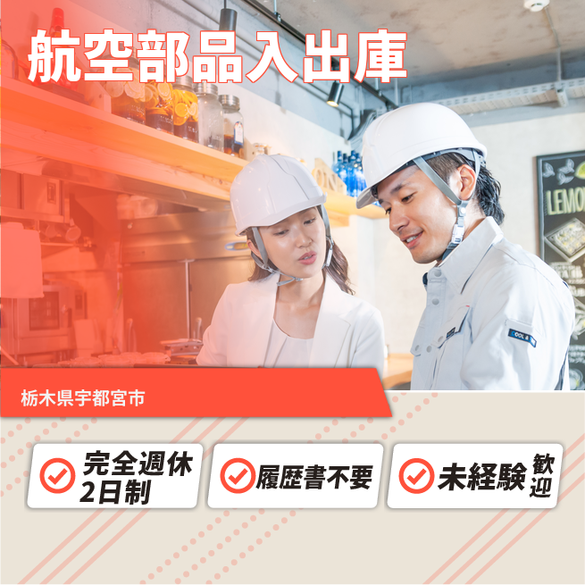給与詳細 例 0円 日給例 10,640円 勤務地 栃木県宇都宮市 仕事内容 航空機部品の入出庫、仕分け、ピッキング業務