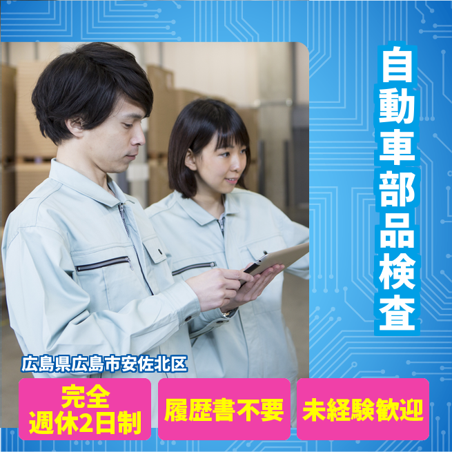 給与詳細 月収例 280,000円 日給例 14,000円 勤務地 広島県広島市安佐北区 仕事内容 品質保証検査業務として、製品図面が満たされているかの検査