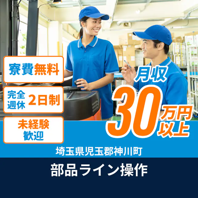 ※実際と異なるケースもございます。 交通費 支給あり 応募の流れ 本ページ内<応募する>ボタンより、必要項目をご入力の上、ご応募ください。 勤務地 【勤務地】埼玉県児玉郡神川町元原 勤務時間 【勤務地】①08:00~17:00 休憩60分