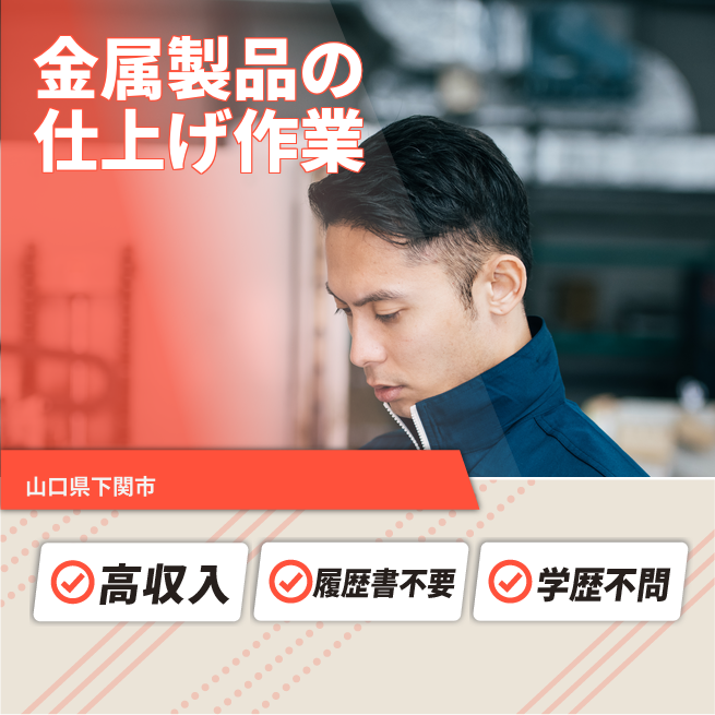 給与詳細 月収例 232,000円 日給例 11,600円 勤務地 山口県下関市 仕事内容 \金属製品の調整作業スタッフ(リフト作業あり)募集/