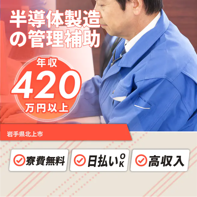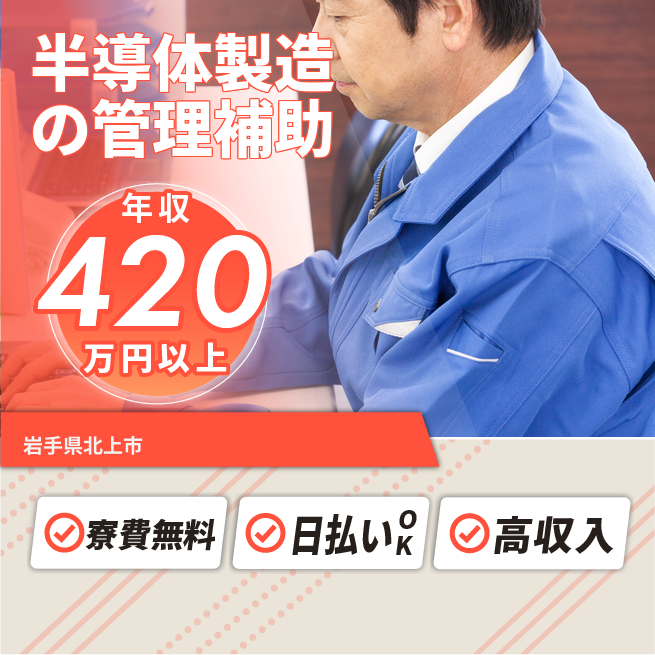 給与詳細 年収例 4,621,680円 月収例 385,140円 勤務地 岩手県北上市 仕事内容 ■半導体半導体やフラッシュメモリー製造半導体ラインの管理補助業務