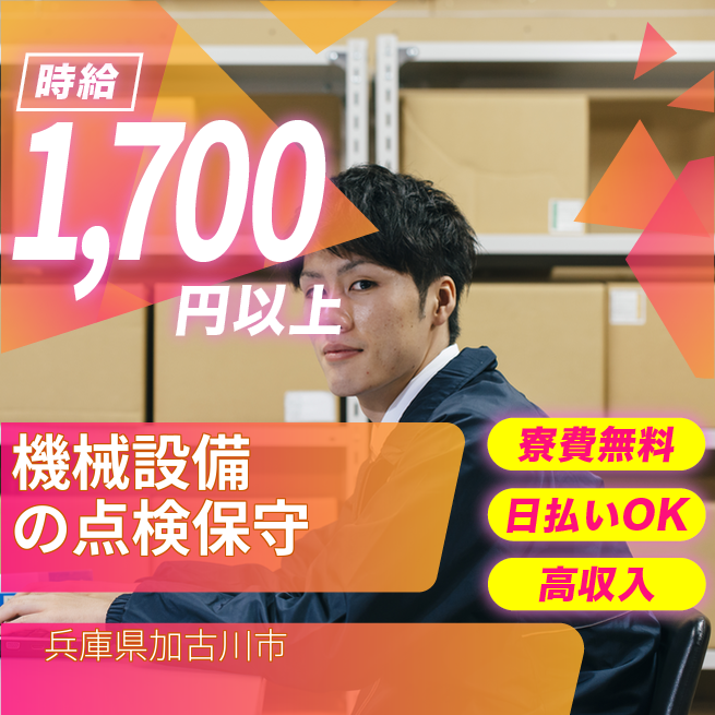 給与詳細 月収例 255,799円 時給例 1,700円 勤務地 兵庫県加古川市 仕事内容 【機械設備の点検・保守業務】