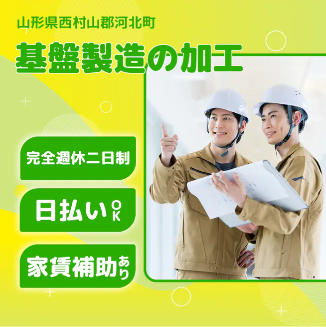 総支給例:27.0万円前後(時給1300円×8.33H×19日+残業1,625円×20H+休出1,625円×8.33+深夜325円×60H) 交通費 支給あり 応募の流れ 本ページ内<応募する>ボタンより、必要項目をご入力の上、ご応募ください。 勤務地 【勤務地】山形県西村山郡河北町谷地真木 勤務時間 【勤務地】①08:30~17:50