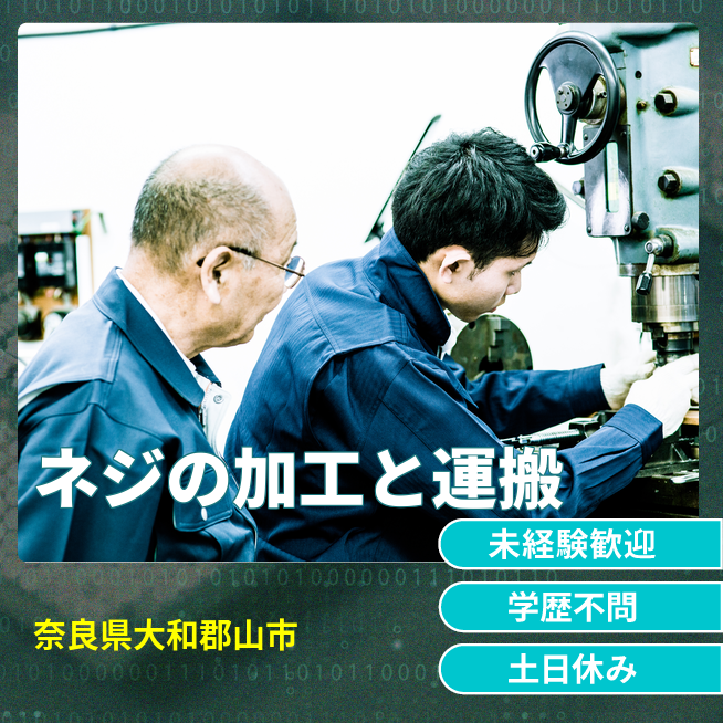 給与詳細 月収例 269,375円 日給例 10,000円 勤務地 奈良県大和郡山市 仕事内容 【ネジの加工業務】