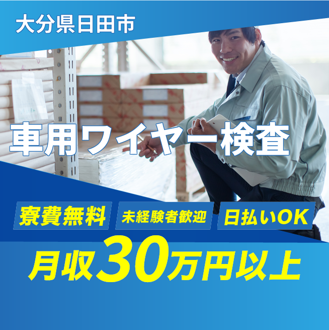 給与詳細 月収例 300,000円 日給例 10,480円 勤務地 大分県日田市 仕事内容 【車に使うワイヤーの検査・箱詰め】