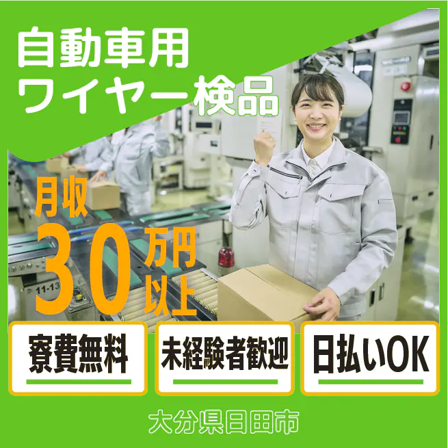 給与詳細 月収例 300,000円 日給例 10,480円 勤務地 大分県日田市 仕事内容 【業務内容】自動車用ワイヤーの検査および箱詰め作業