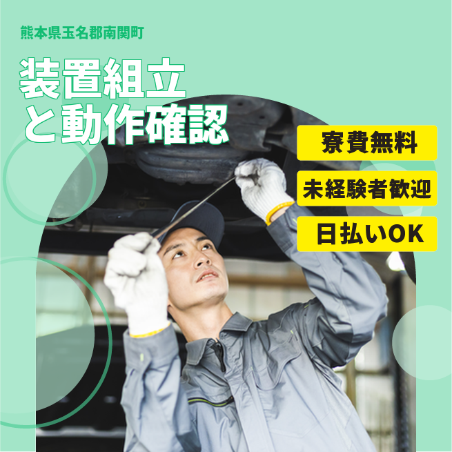 ※157円レートで8,790円程度 交通費 支給あり 応募の流れ 本ページ内<応募する>ボタンより、必要項目をご入力の上、ご応募ください。 勤務地 【勤務地】熊本県玉名郡南関町肥猪 勤務時間 【勤務地】▼国内研修時