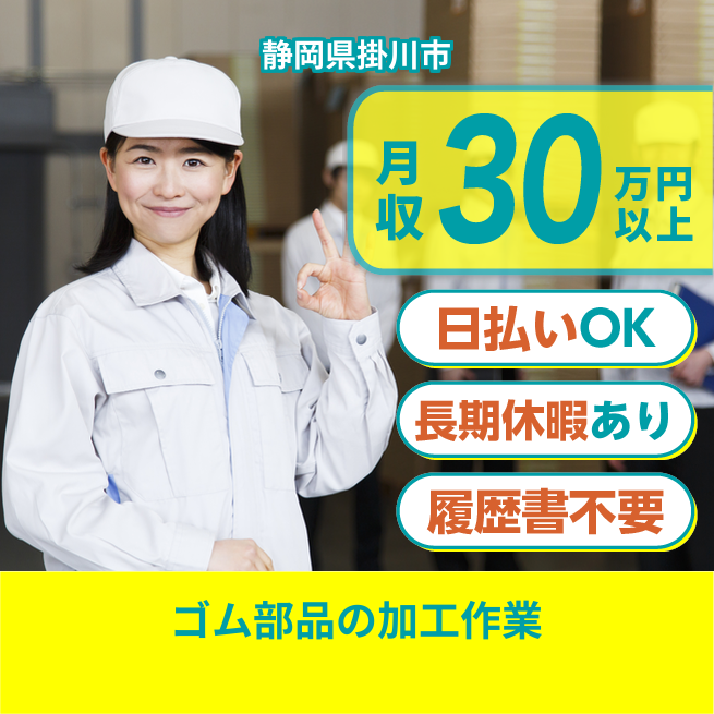 給与詳細 月収例 320,000円 日給例 12,000円 勤務地 静岡県掛川市 仕事内容 【小物ゴム部品の加工】