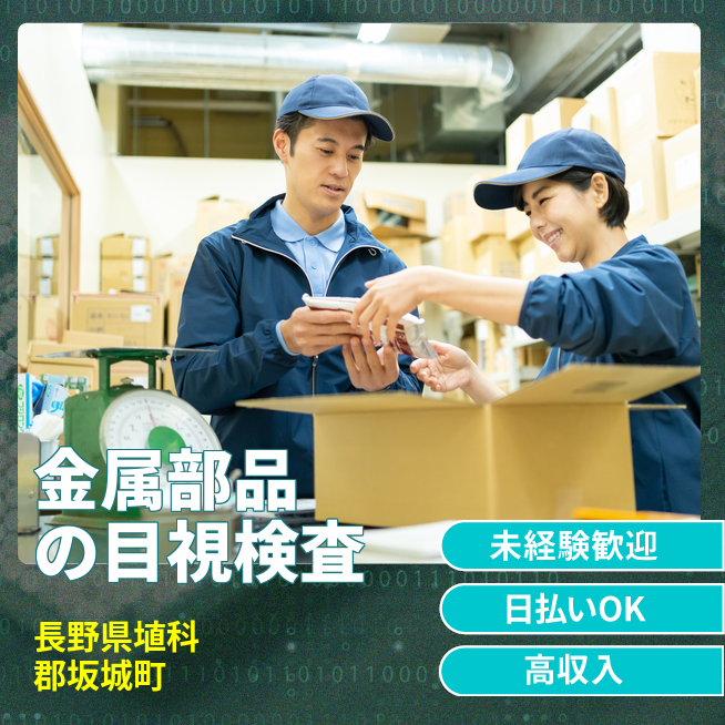 給与詳細 月収例 280,000円 日給例 12,400円 勤務地 長野県埴科郡坂城町 仕事内容 【金属部品の目視検査】