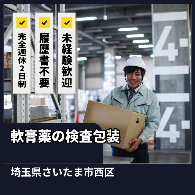 給与詳細 月収例 253,500円 日給例 10,400円 勤務地 埼玉県さいたま市西区 仕事内容 軟膏医薬品の検査や包装作業、その他付随業務。軟膏が入ったチューブやボトルなどの容器にキズや凹みがないかの外観検査、箱詰めを行います。