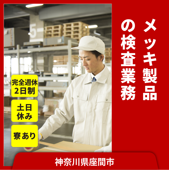 メッキ加工後の製品の目視検査を行い、不適合品を見分ける業務となります(メッキの傷、ヒビやヨレを見つけます)。併せてボス(足折り)カット 作業もお任せします。メッキ加工後、ハンガーに掛かっている製品を外しラインにハンガーを架け替る作業もあります(重さは最大20kg程度)