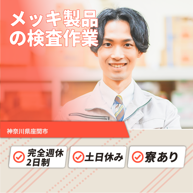 メッキ加工後の製品の目視検査を行い、不適合品を見るける業務となります(メッキの傷、ヒビやヨレを見つけます)。併せてボス(足折り)カット 作業もお任せします。