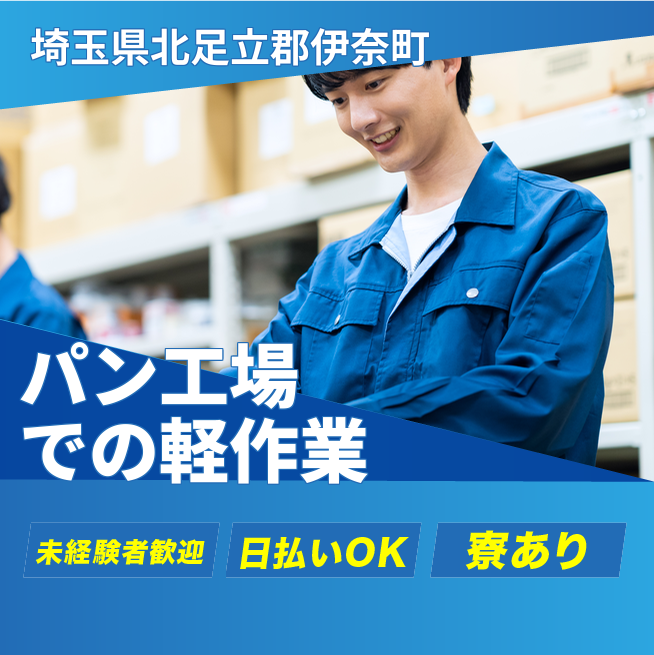 給与詳細 月収例 272,378円 日給例 10,800円 勤務地 埼玉県北足立郡伊奈町 仕事内容 【パン製造工場にてシール貼り軽作業】
