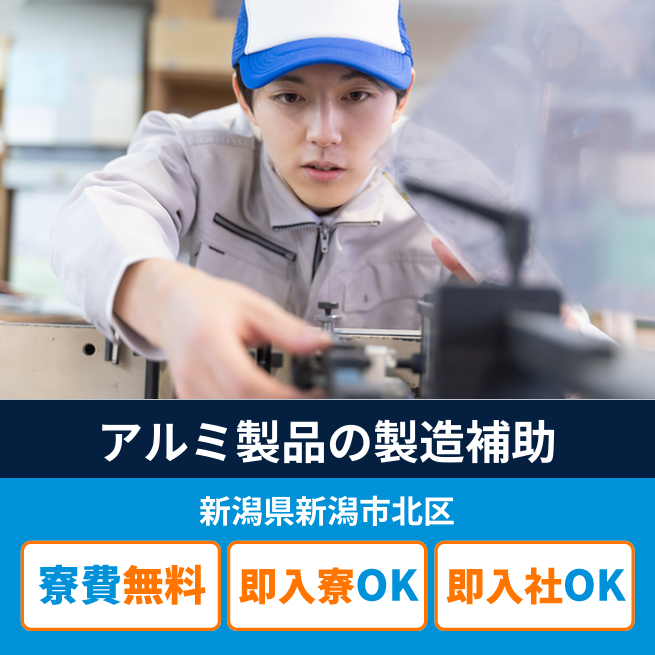 給与詳細 月収例 236,105円 時給例 1,220円 勤務地 新潟県新潟市北区 仕事内容 【アルミ製品の製造補助】