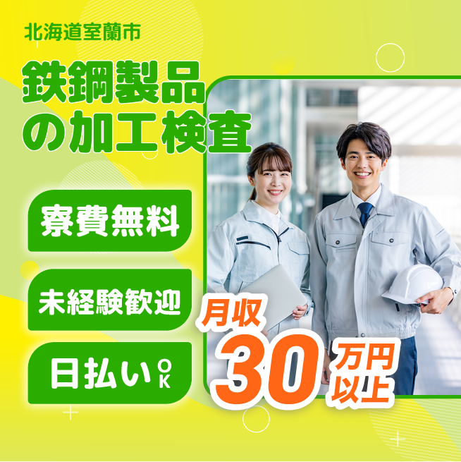 給与詳細 月収例 300,038円 日給例 11,200円 勤務地 北海道室蘭市 仕事内容 【鉄鋼製品の加工・検査】