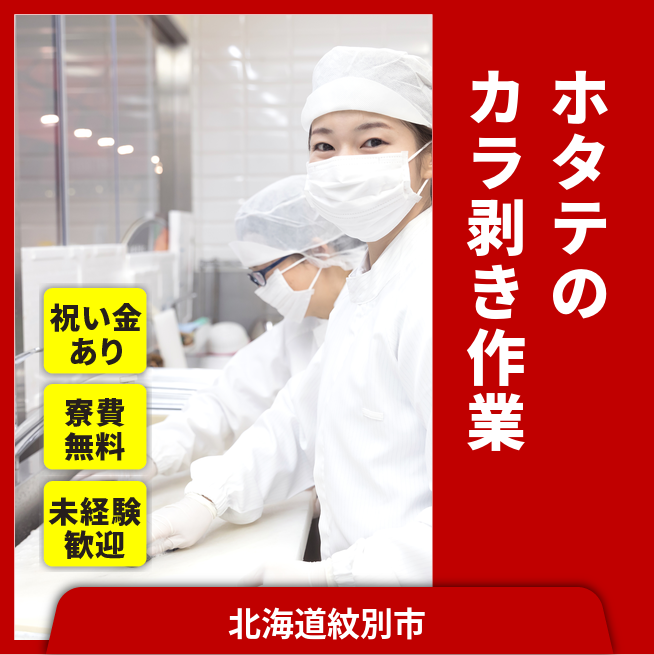 給与詳細 月収例 191,675円 時給例 1,100円 勤務地 北海道紋別市 仕事内容 【ホタテのカラ剥き】