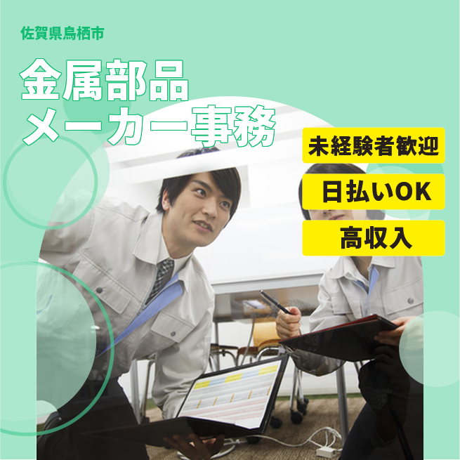 給与詳細 月収例 267,750円 日給例 11,200円 勤務地 佐賀県鳥栖市 仕事内容 【メーカー工場オフィスでの事務スタッフ】