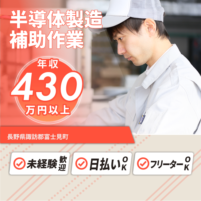 給与詳細 年収例 4,320,000円 月収例 360,000円 勤務地 長野県諏訪郡富士見町 仕事内容 【製造マシンの補助】