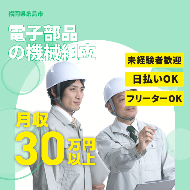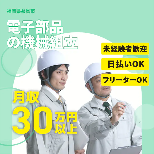 給与詳細 月収例 300,000円 日給例 11,200円 勤務地 福岡県糸島市 仕事内容 【電子部品を機械で組立】