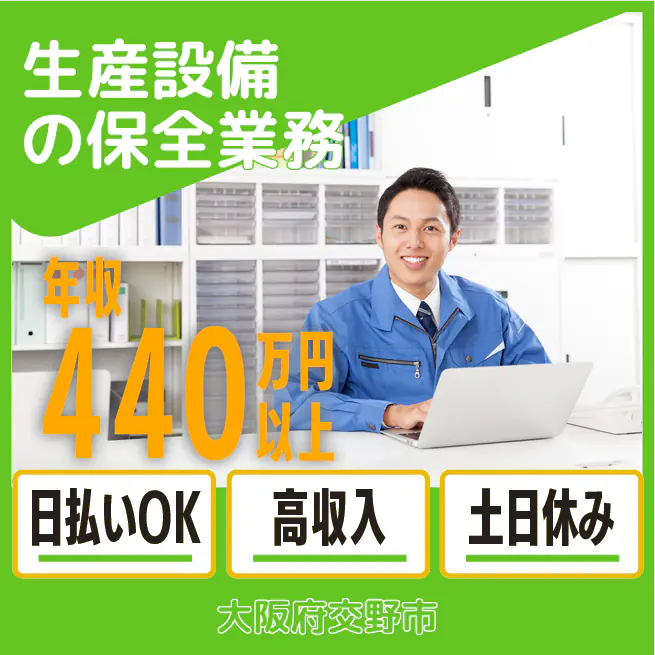 給与詳細 年収例 4,440,000円 月収例 370,000円 勤務地 大阪府交野市 仕事内容 【生産設備の日常保全】