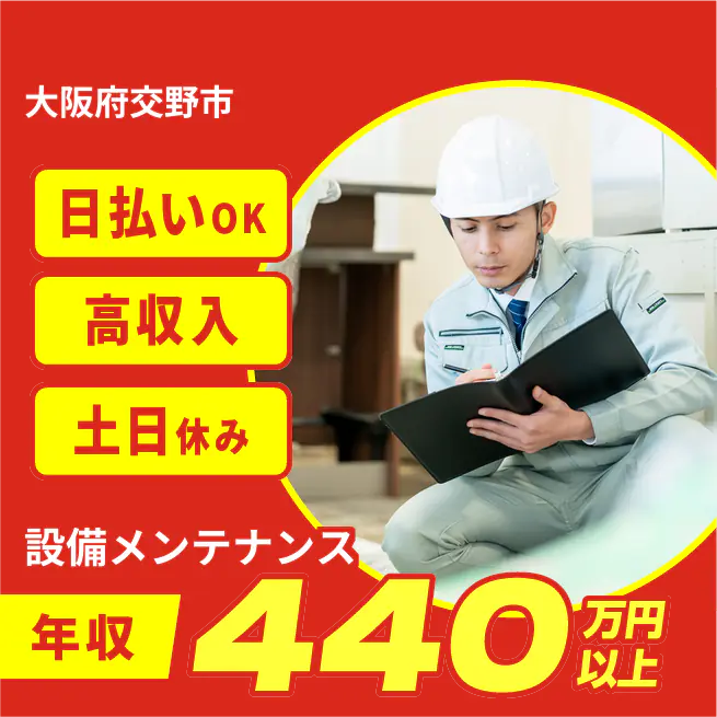 給与詳細 年収例 4,440,000円 月収例 370,000円 勤務地 大阪府交野市 仕事内容 【業務内容】