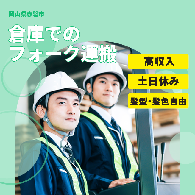 給与詳細 月収例 271,875円 日給例 12,000円 勤務地 岡山県赤磐市 仕事内容 倉庫内作業 フォークリフ作業。