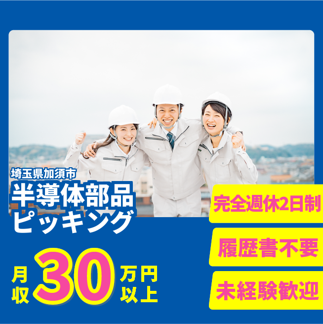 給与詳細 月収例 312,000円 時給例 1,600円 勤務地 埼玉県加須市 仕事内容 半導体製造装置の部品のピッキング、みずすまし業務