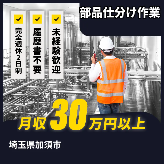 給与詳細 月収例 312,000円 時給例 1,600円 勤務地 埼玉県加須市 仕事内容 【業務内容】