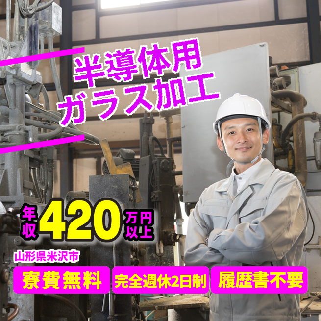 給与詳細 年収例 4,200,000円 月収例 350,000円 勤務地 山形県米沢市 仕事内容 半導体用ガラスの製造