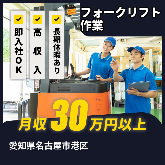 給与詳細 月収例 308,800円 時給例 1,600円 勤務地 愛知県名古屋市港区 仕事内容 【業務内容】