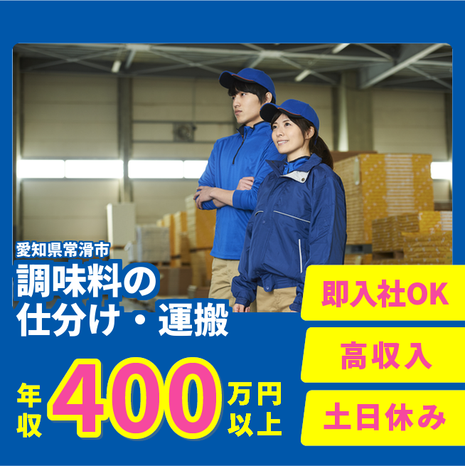 給与詳細 年収例 4,016,256円 月収例 334,688円 勤務地 愛知県常滑市 仕事内容 調味料の仕分け・リフト運搬/日勤