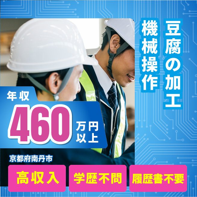 給与詳細 年収例 4,674,600円 月収例 389,550円 勤務地 京都府南丹市 仕事内容 豆腐の加工機械オペレーター/2交替勤務