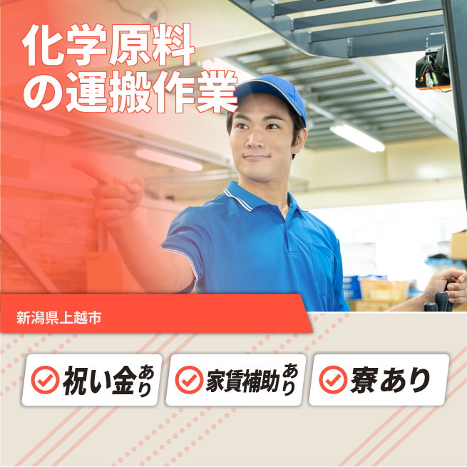 給与詳細 月収例 256,750円 時給例 1,300円 勤務地 新潟県上越市 仕事内容 化学原料の製造・倉庫内作業/3交替勤務